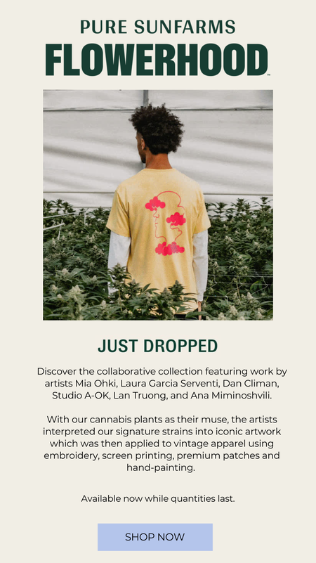 Creativity and cannabis have always been friends. Flowerhood celebrated that connection by collaborating with six artists to reimagine Pure Sunfarms’ signature strains as works of art. The result was a limited collection of vintage pieces—hand-painted, screen-printed, and embroidered—paired with an artist docu-series to bring it all to life.